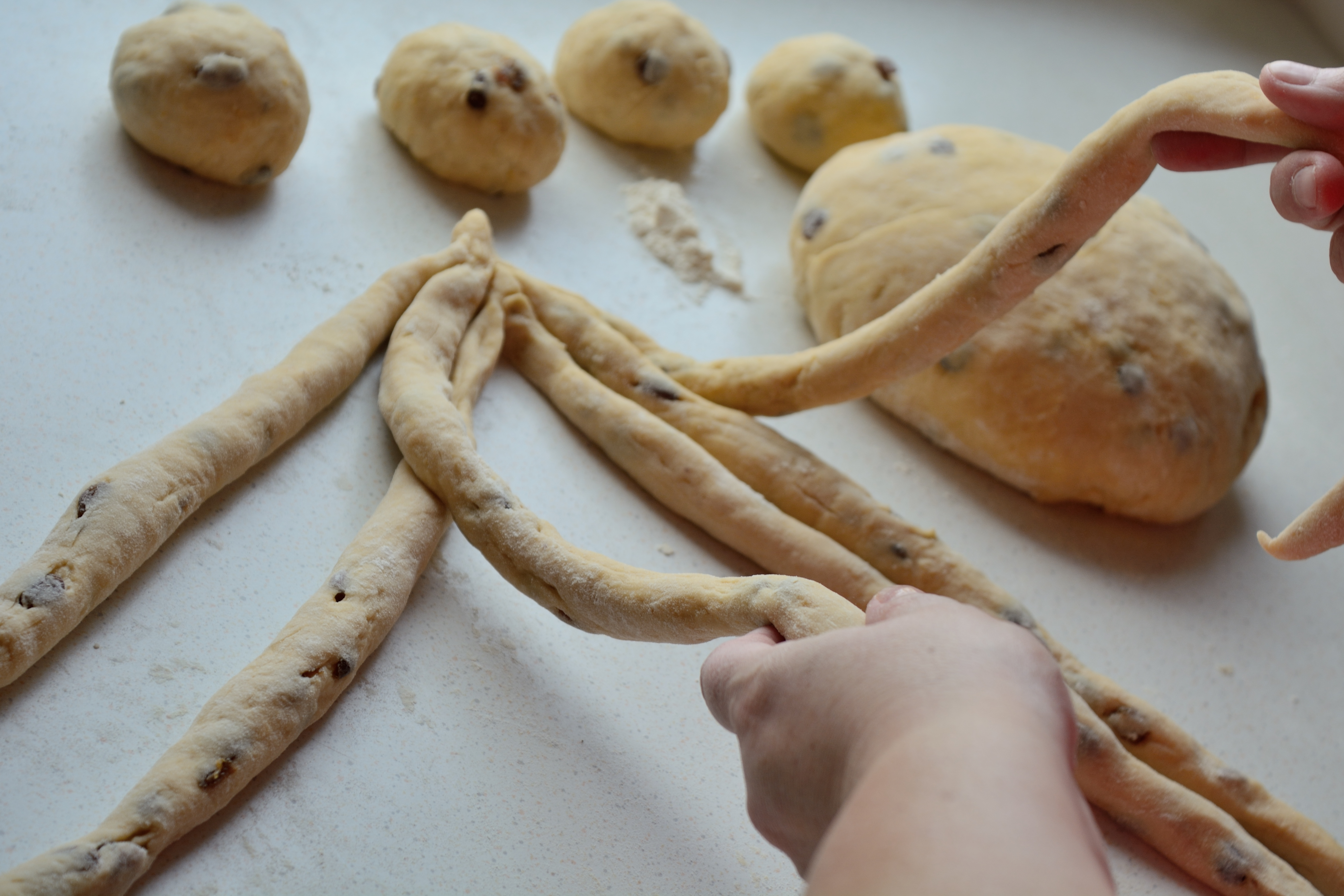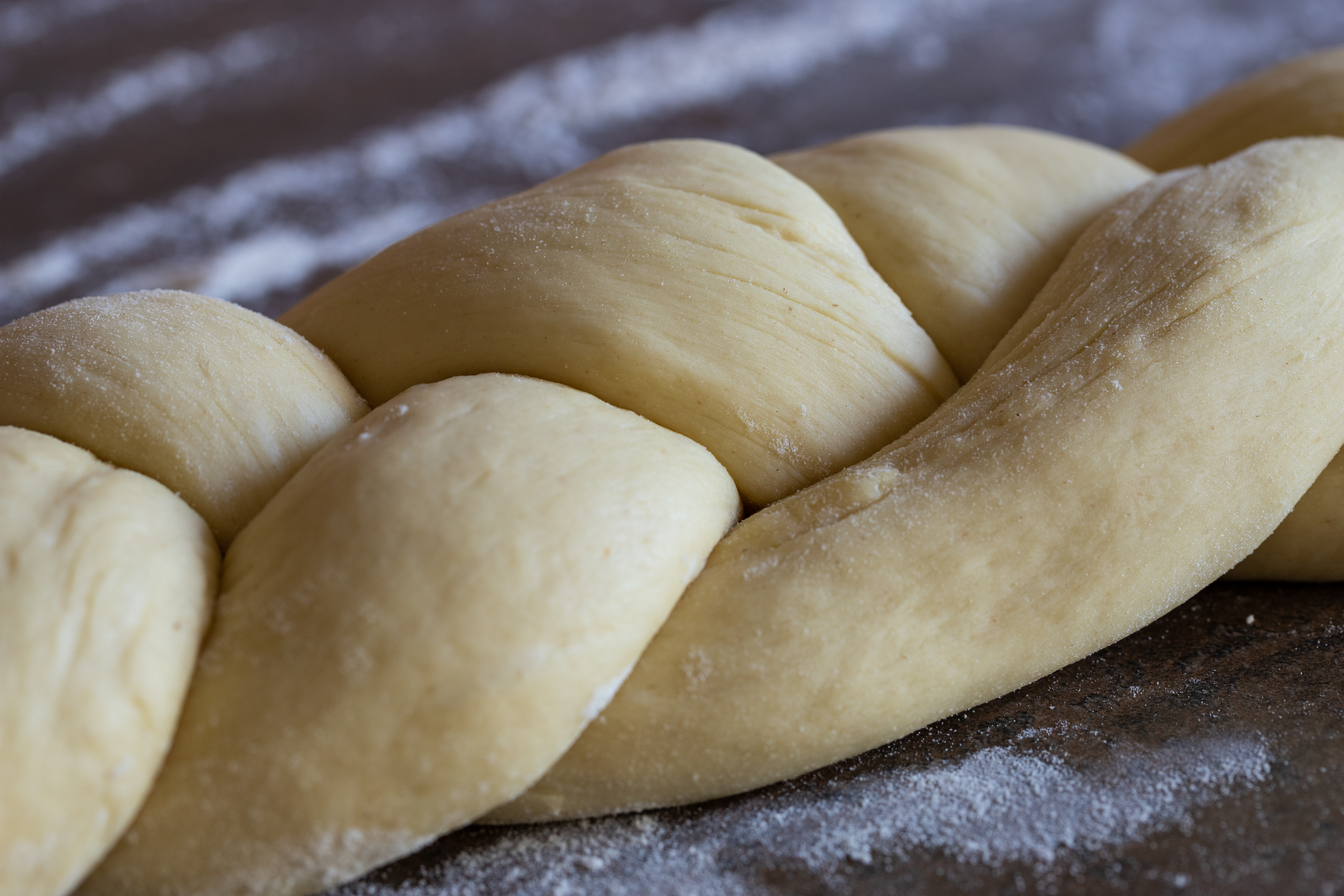 Klassisch wird der Striezel mit 3 Strängen geflochten, das funktioniert ganz einfach wie beim Zopfflechten mit Kinderhaaren.