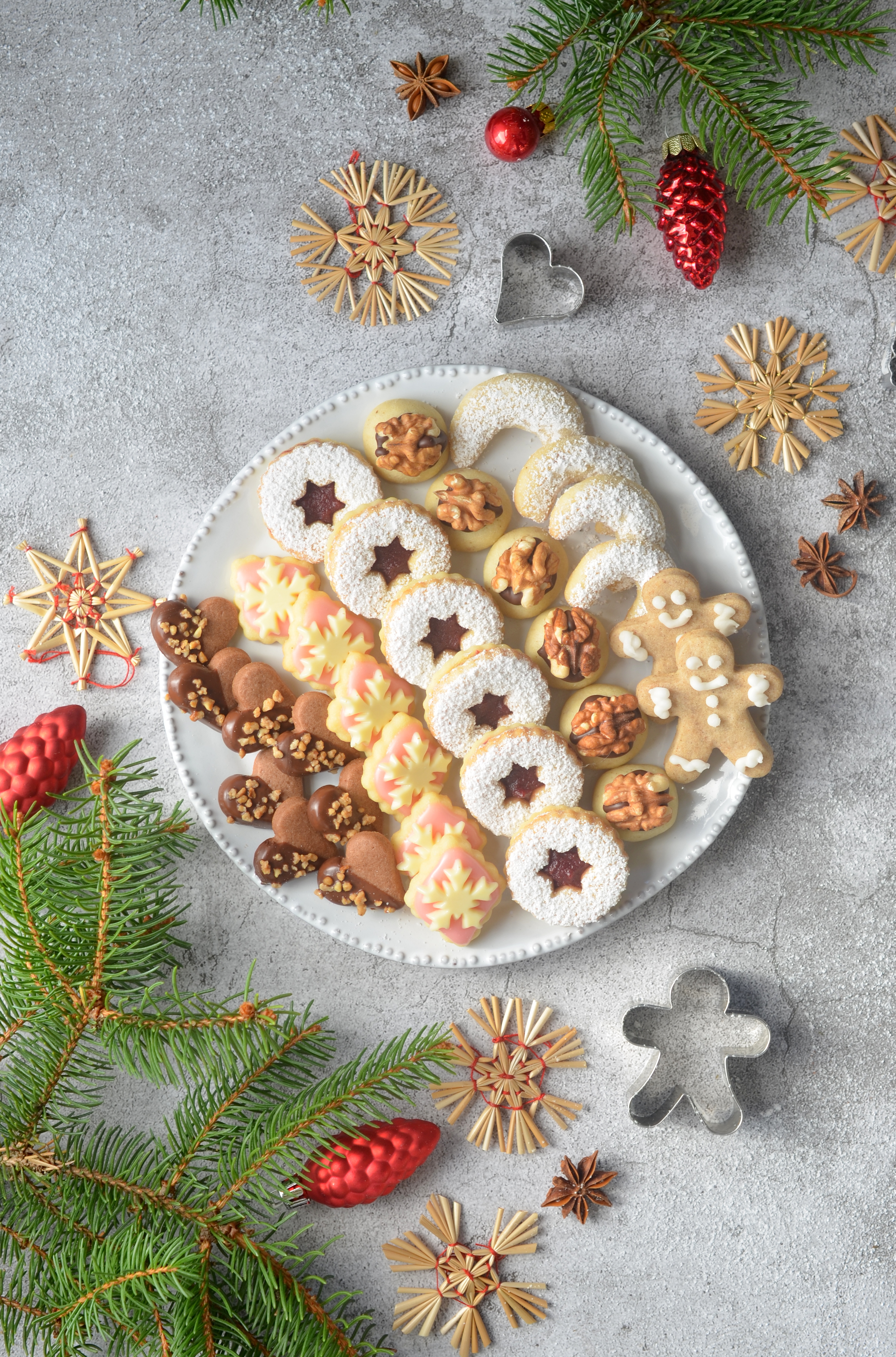 Überlege dir, wie viele und welche Sorten du backen möchtest und was du dafür brauchst. Für unseren abgebildeten Keksteller haben wir folgendes Gebäck ausgewählt: