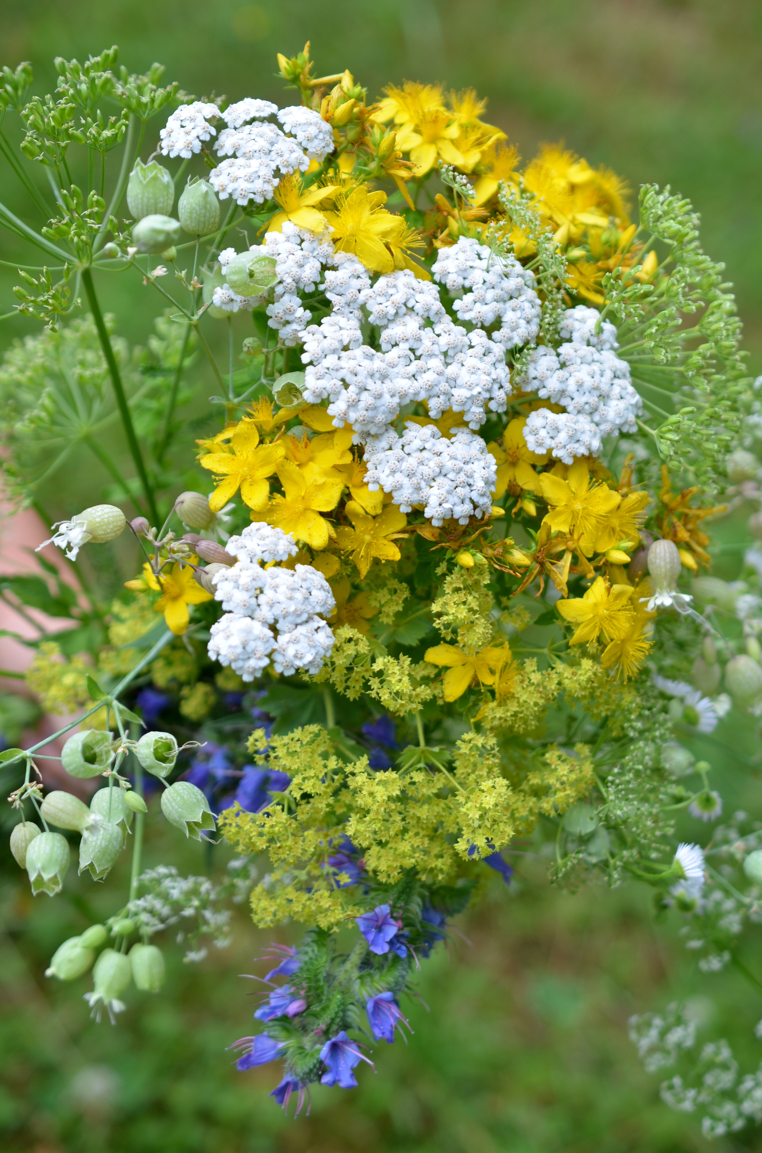Kräuter und Blumen, die zur Zeit der Sommersonnenwende blühen, werden als Johanniskräuter bezeichnet und sollen besonders heilkräftig sein. Mit ihren strahlenden Blüten in gelb, orange oder weiß symbolisieren sie die Sonne. Wir können sie zu traditionellen Sonnwendbuschen binden, die, an der Haustür befestigt, Mensch und Tier im kommenden Jahr segnen und beschützen sollen. In so einem Sonnwendbuschen haben viele Pflanzen Platz, beispielsweise: