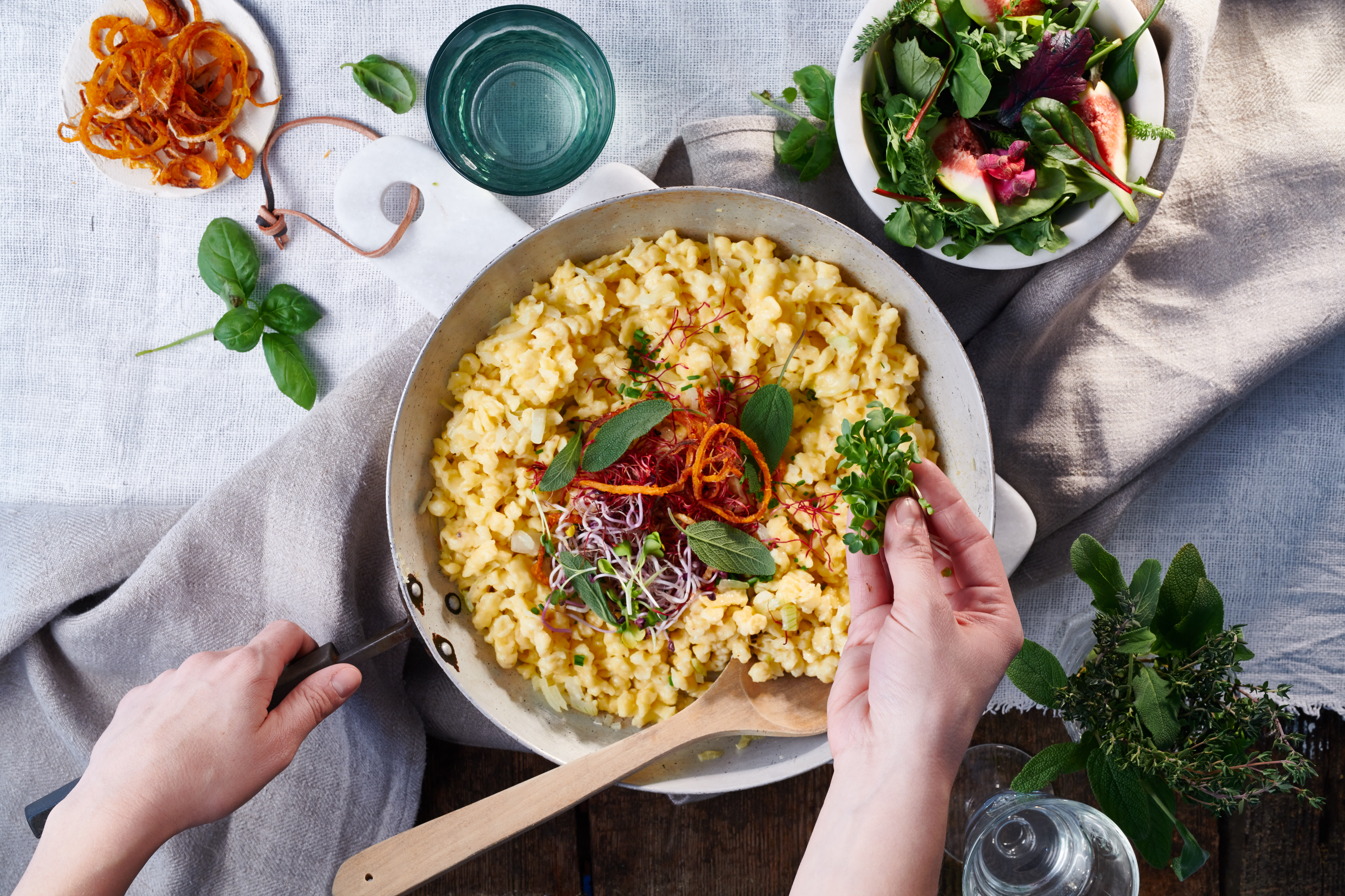 Jeder kennt Käsespätzle, alle lieben Eiernockerl. Aber hast du sie schon einmal in einer rahmigen Pilzsauce probiert? Oder ganz rustikal mit Röstzwiebeln, Käse und Speck? Mit Frühlingsgemüse aus dem Ofen? Oder pur mit zerlassener Butter und Schnittlauch?