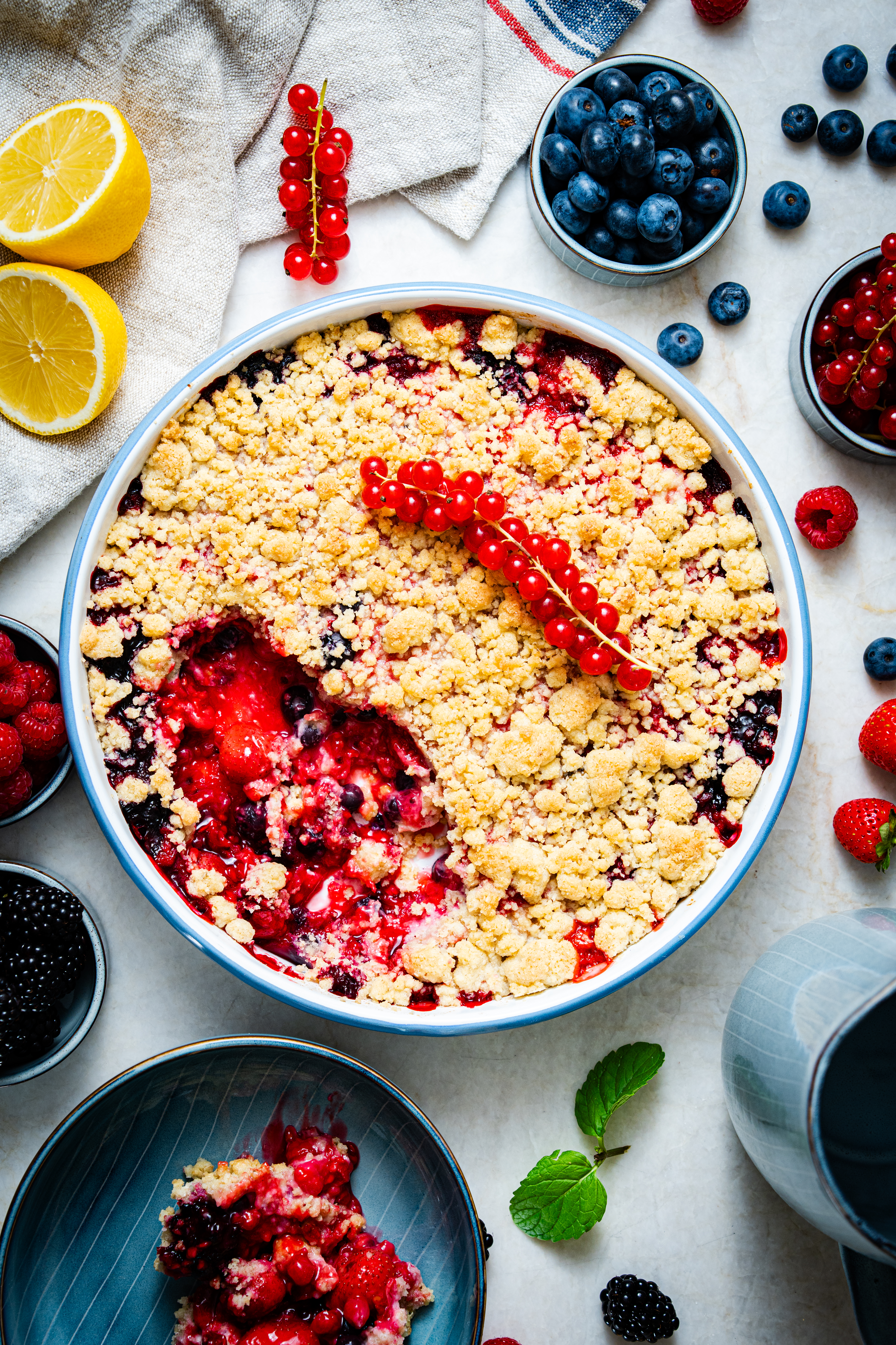 Die Streusel auf den Beeren verteilen.