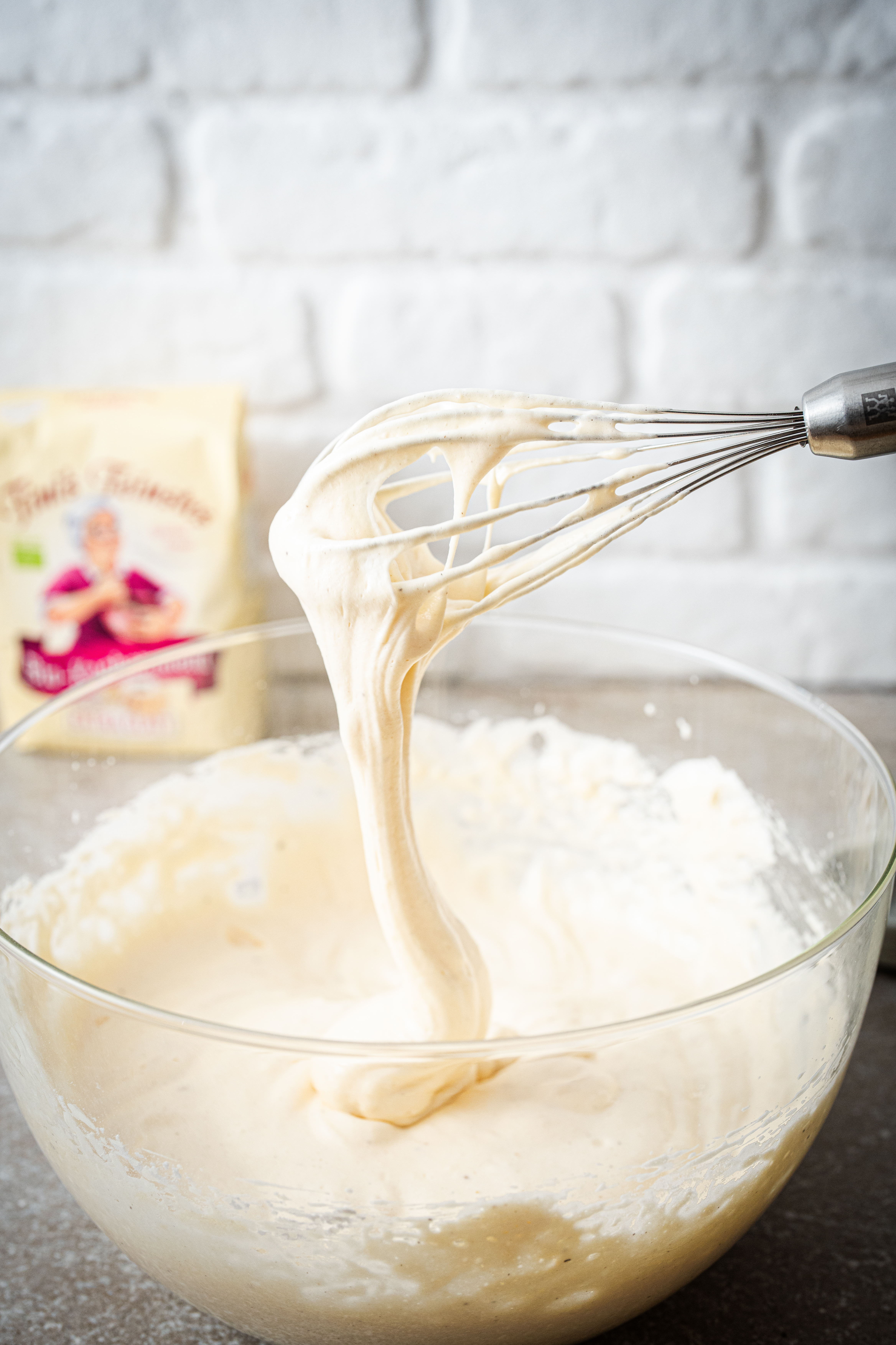 Nun die Dotter dazu mixen bis die Masse luftig geworden ist.