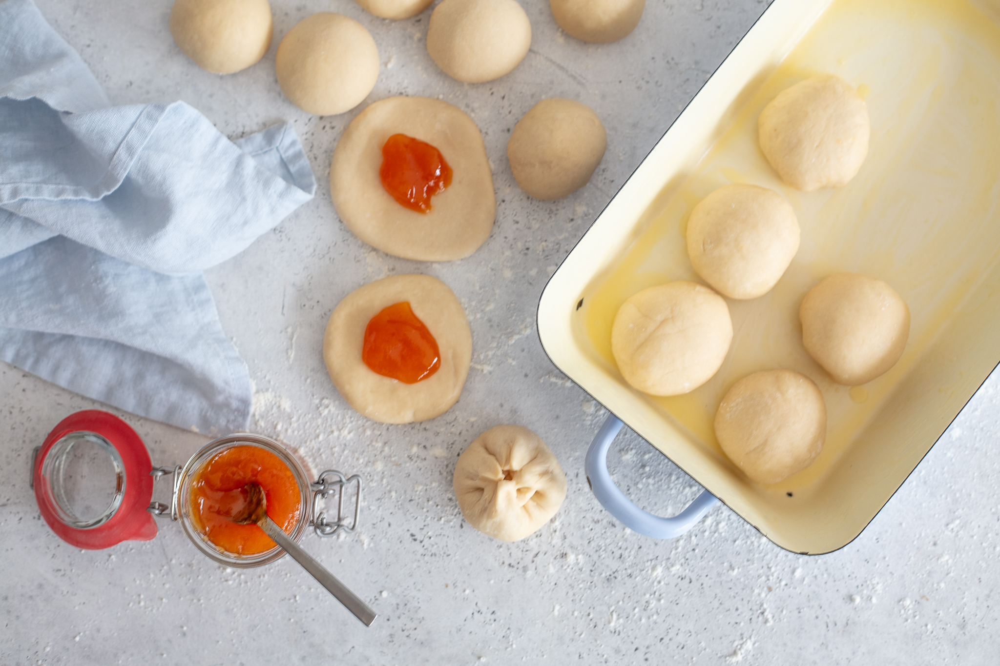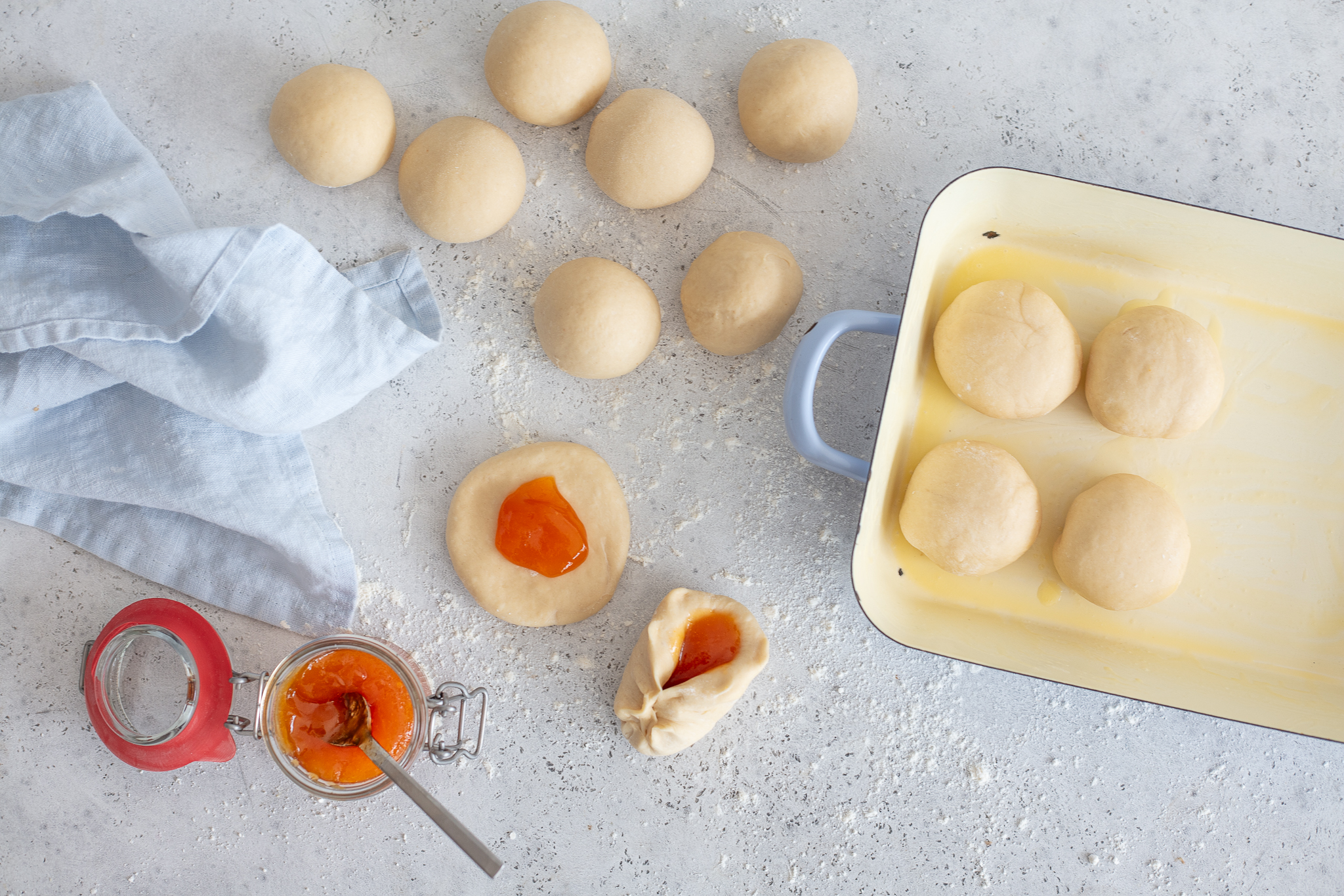Teigstücke über der Fülle zusammendrücken und gut verschließen. Dann in flüssige Butter tauchen und mit der Verschlussseite nach unten in eine gut gebutterte Auflaufform schlichten. Nochmal bedeckt ca. 30 Min. gehen lassen.