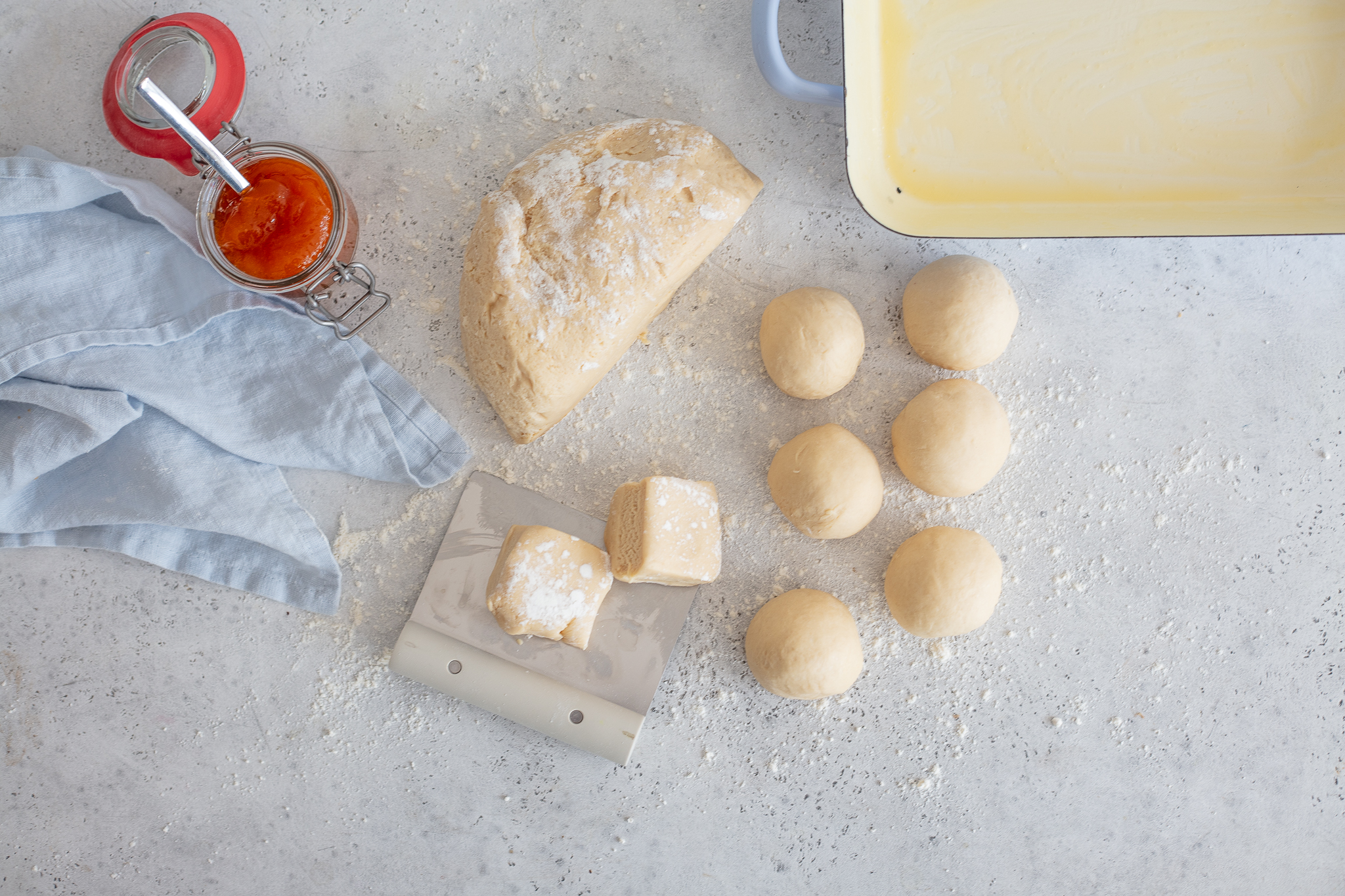 Teig nach dem Rasten auf der Arbeitsfläche zu einer Rolle formen und mithilfe einer Teigkarte in 12 gleich große Stücke teilen.