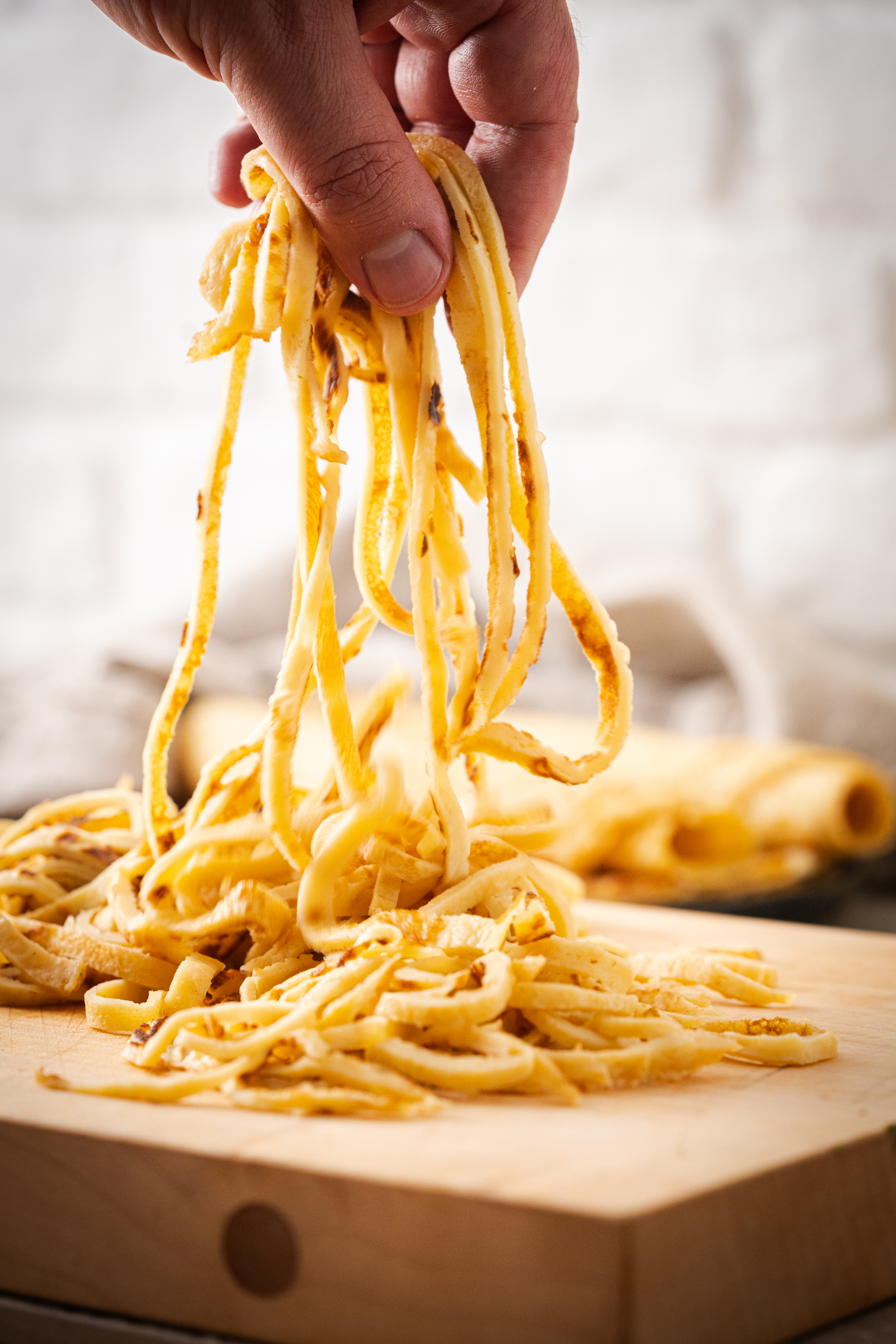 Die Palatschinken einrollen und in dünne Streifen schneiden.