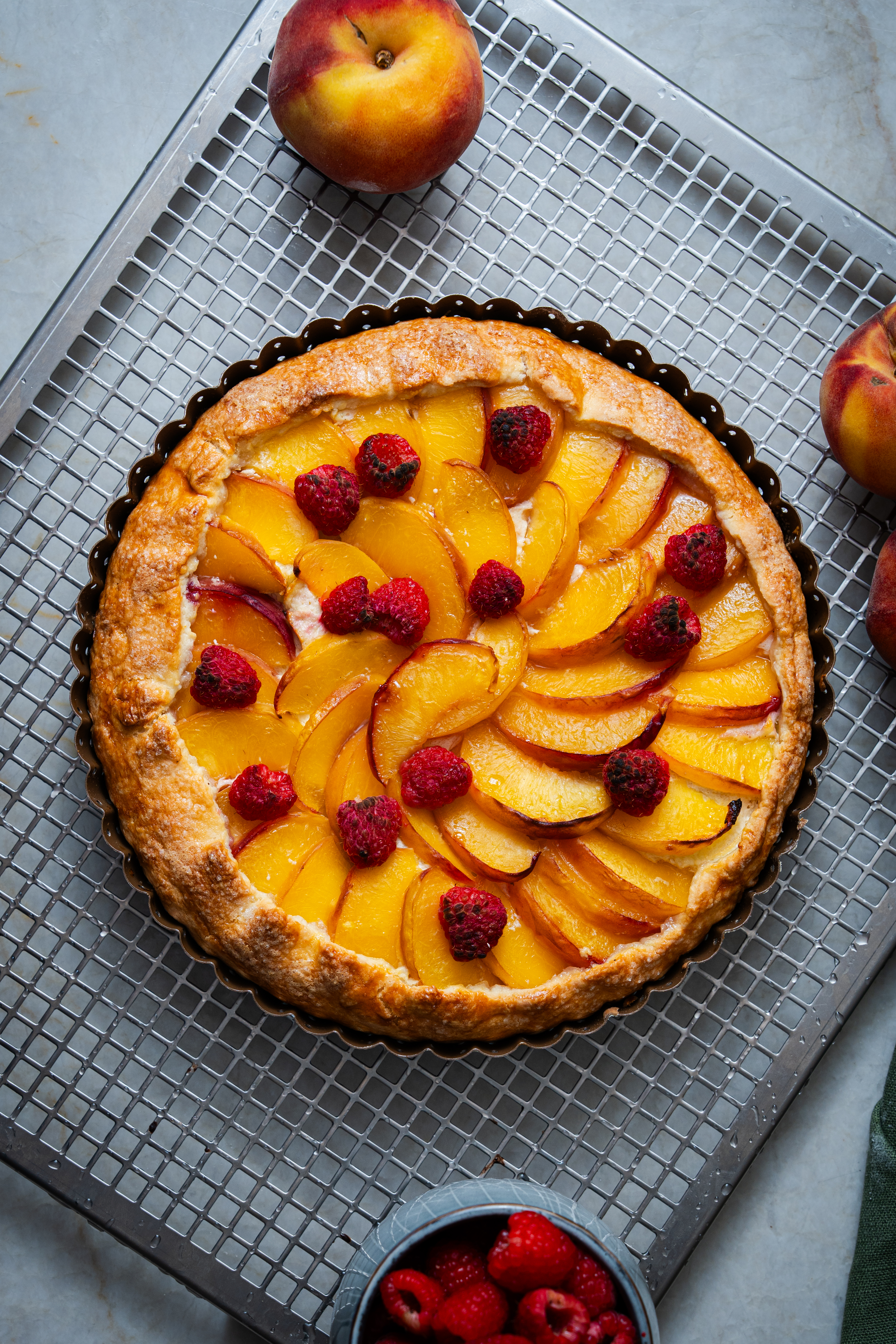 Pfirsiche fächerförmig darauflegen, die Himbeeren darauf verteilen und den Teigrand nach innen einklappen.
