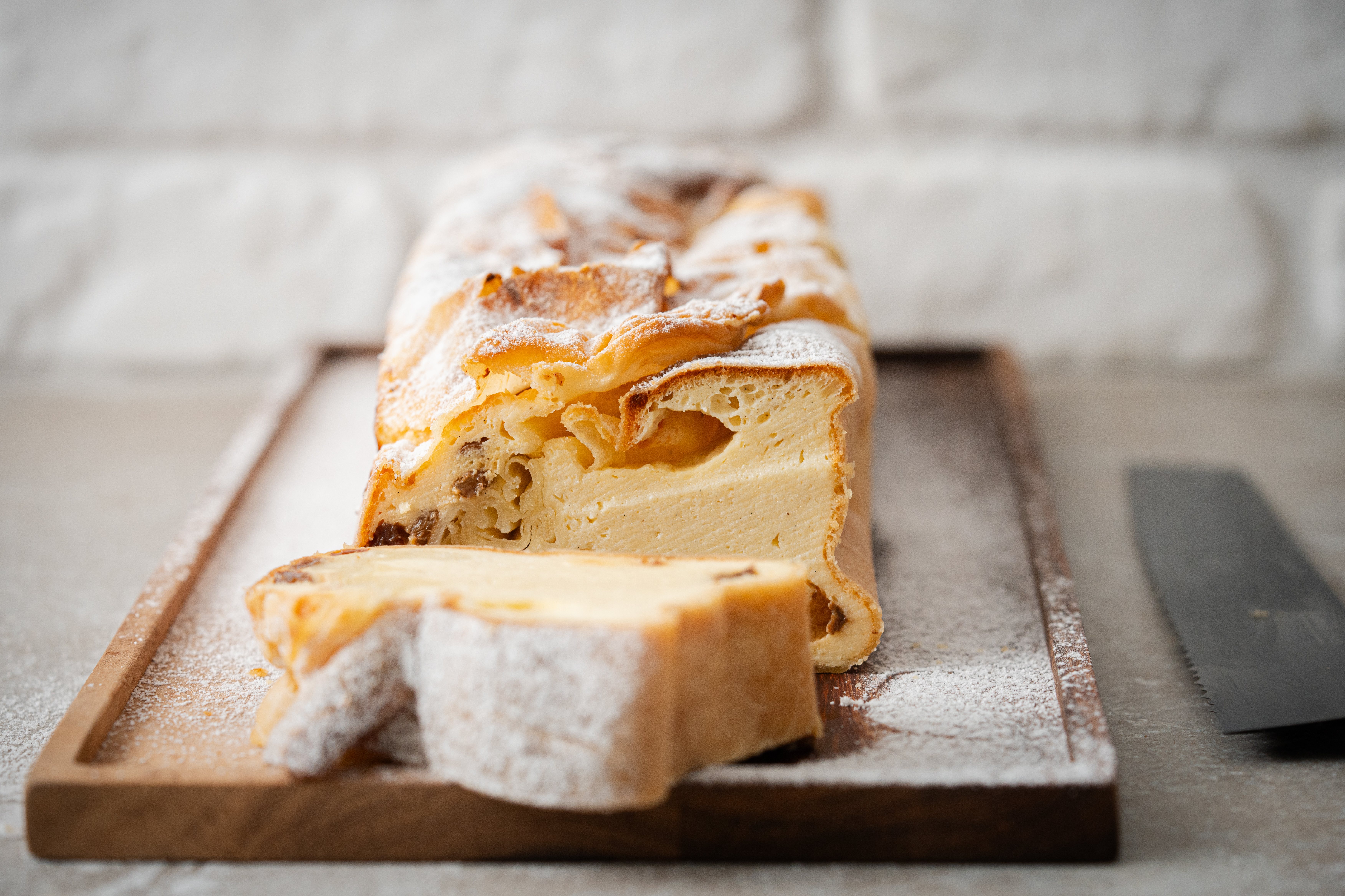 Den Strudel in eine Kastenform geben, damit er nicht verläuft, mit Butter bestreichen und bei 200°C Ober-/Unterhitze für ca. 40 Minuten backen.