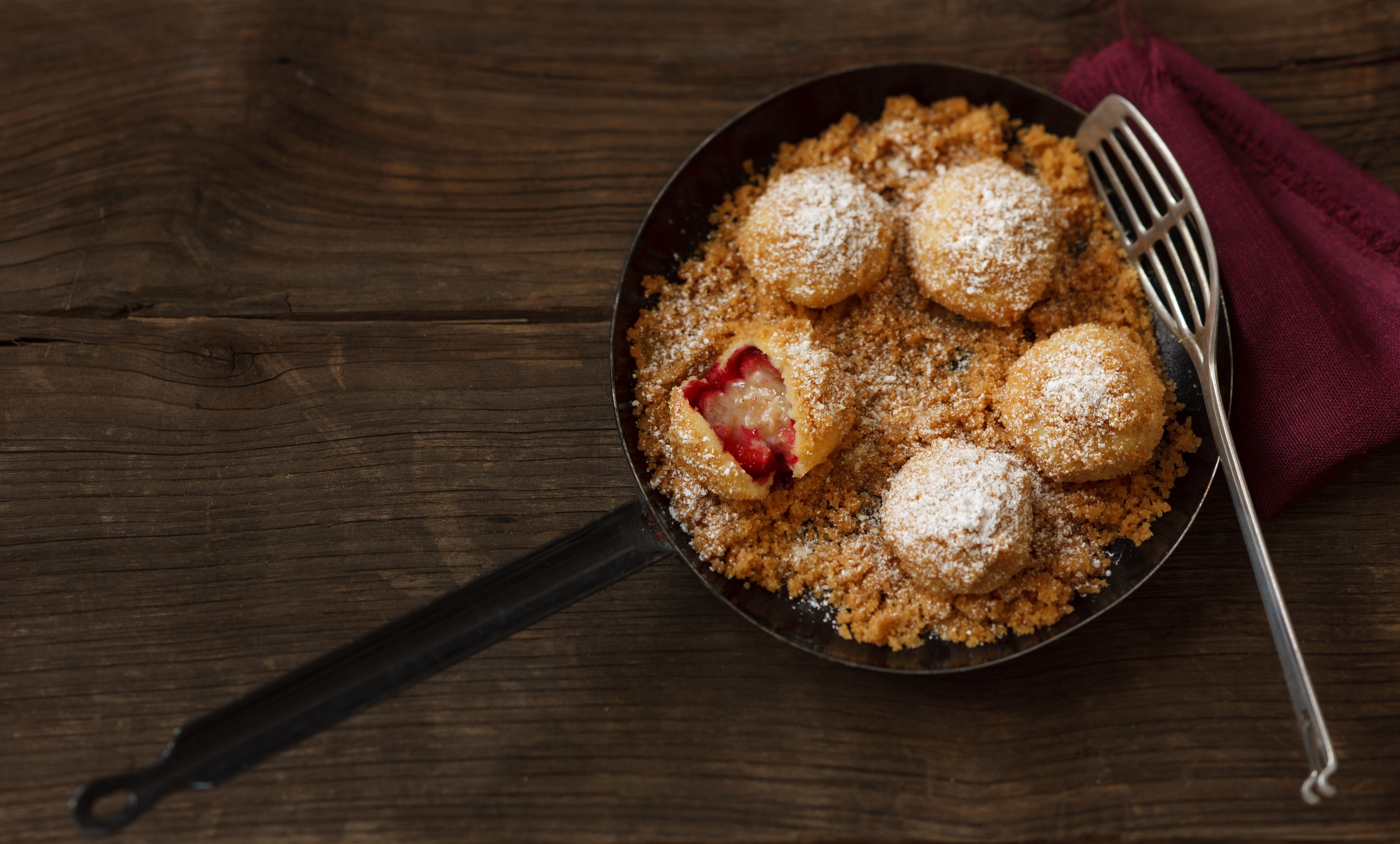 Die Knödel können beliebig gefüllt werden (bspw. mit Erdbeeren oder Marillen).